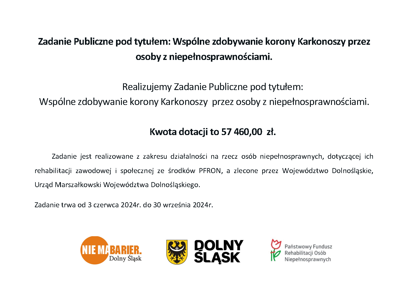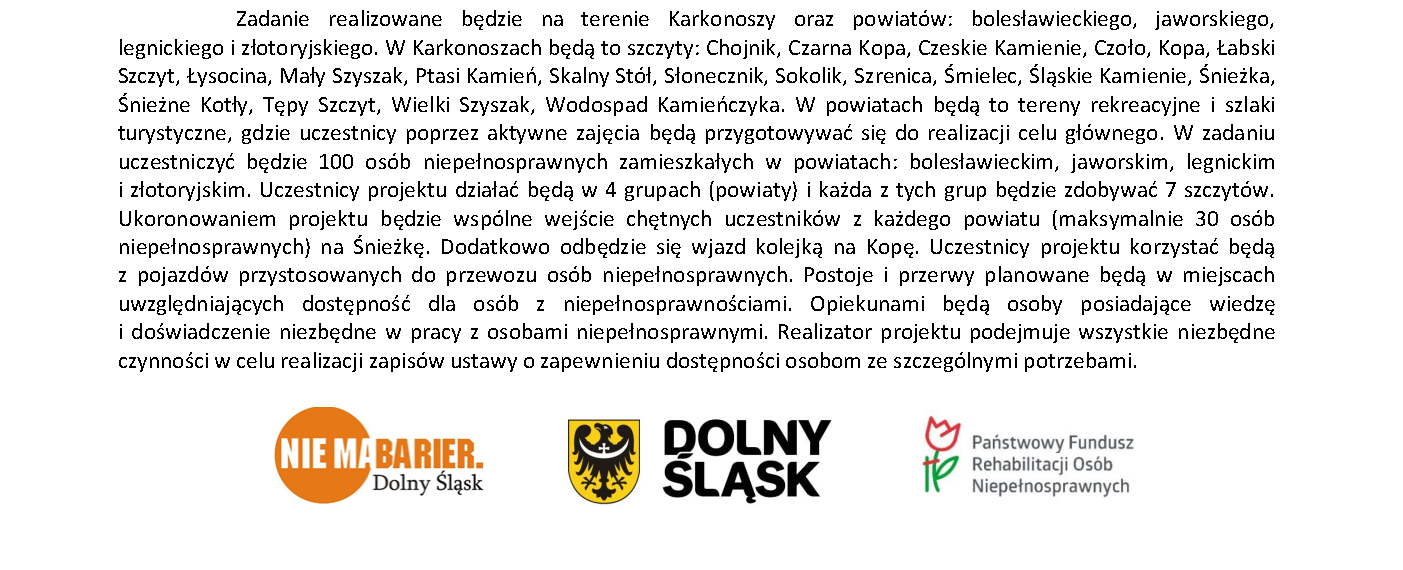 Towarzystwo Przyjaciół Dzieci Koło Razem Naj realizuje Zadanie Publiczne pod tytułem: "Wspólne zdobywanie korony Karkonoszy przez osoby z niepełnosprawnościami."